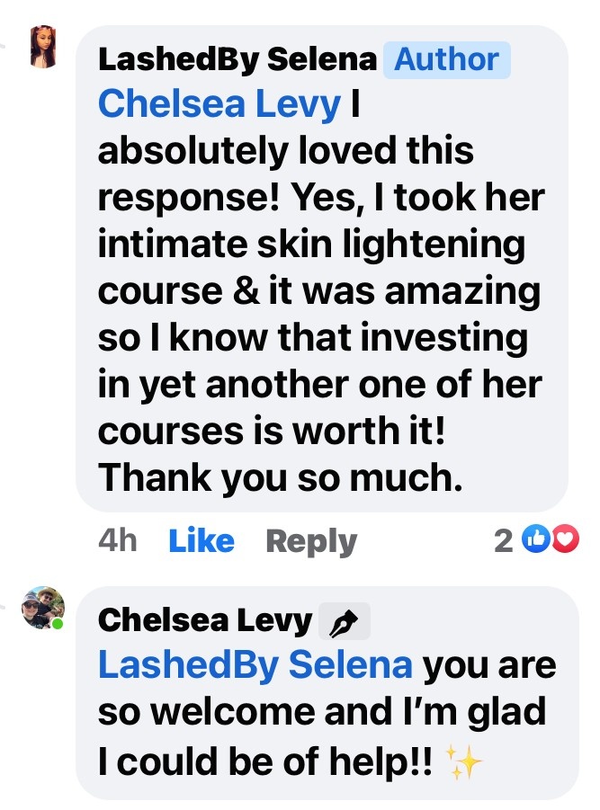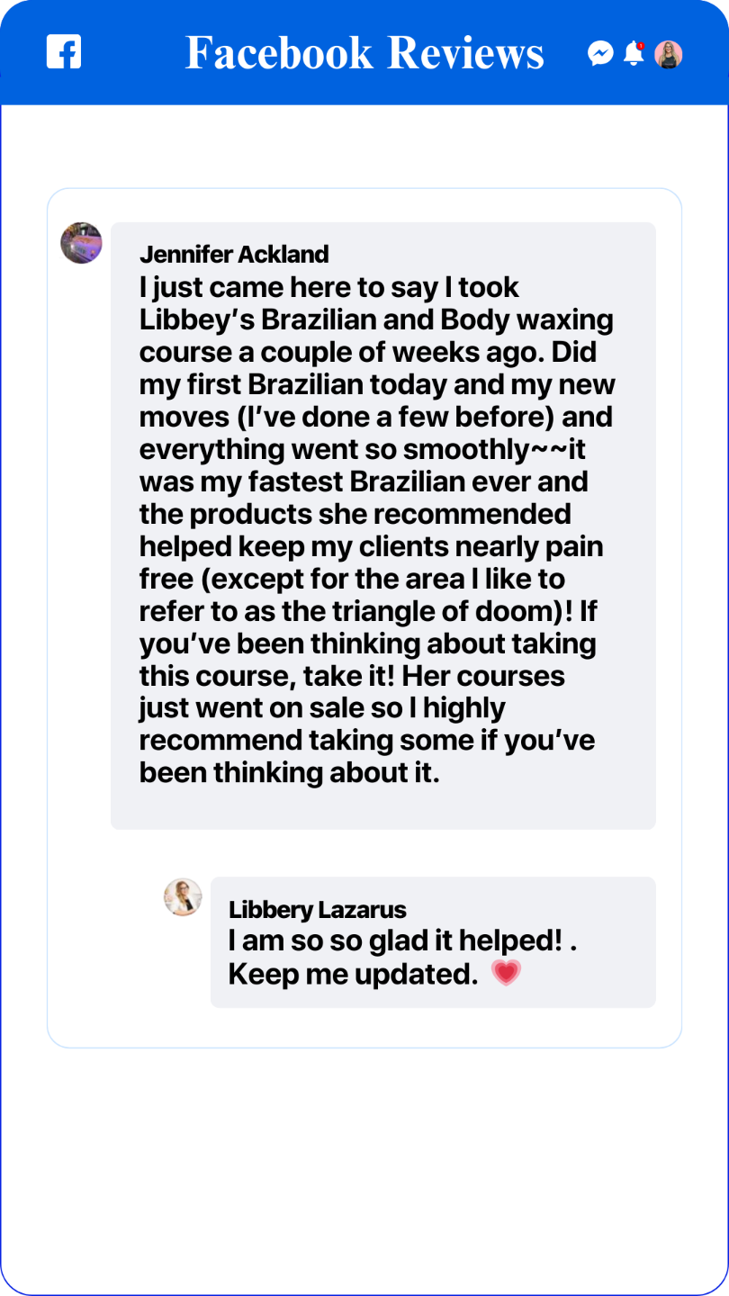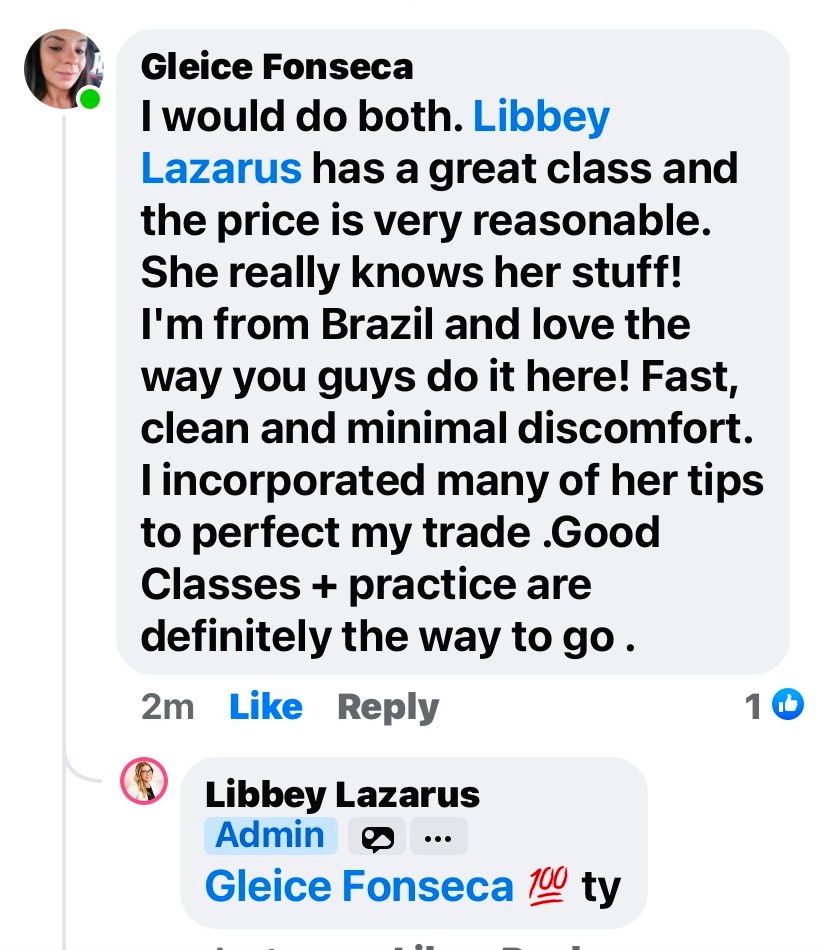 She is such a supportive mentor! I've bought many classes in the industry and what makes hers different is that she's there for you after you buy her class. Her passion for the industry and to truly help you succeed shows. I've added significant more value to my business, services, and clients. After doing her Wax your way to 100k I'm confident about growing my Brazilian waxing business!