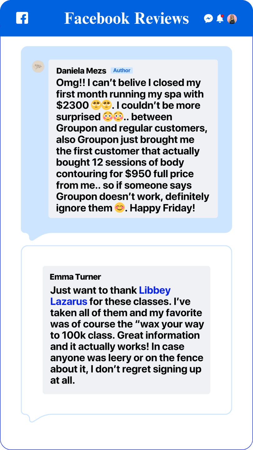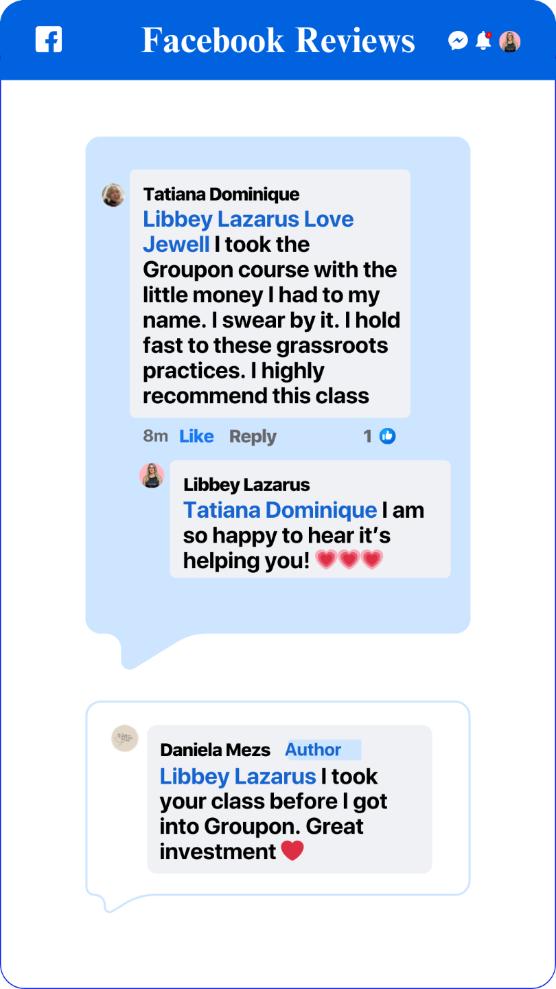 Libbey made her course engaging and easy to understand. She started her business with 0 clients and built her books with Groupon.